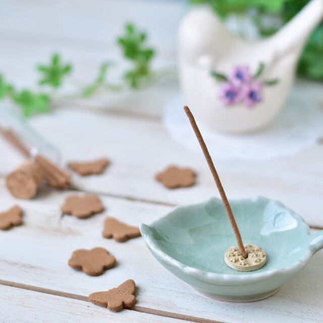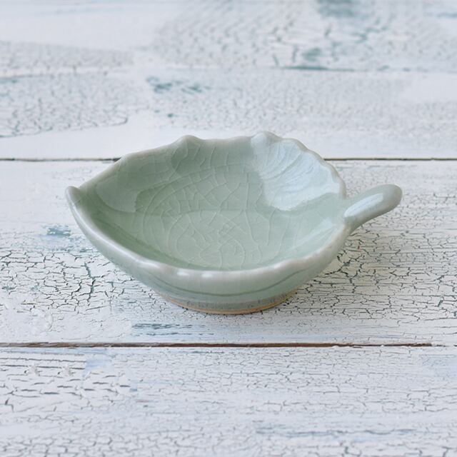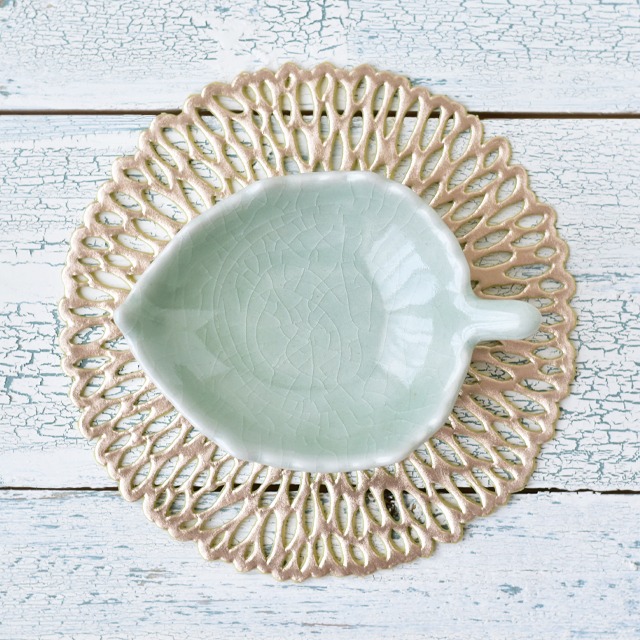 美しいグリーンが印象的なタイの伝統的な青磁器です。 繊細に入ったひび模様(貫入)に味が感じられます。 かわいいリーフの小皿で、香皿にぴったりなサイズです。 もちろん、小物入れなどのトレイとしてもお使いいただけます。 ※画像内の小物等は商品に含まれておりません。