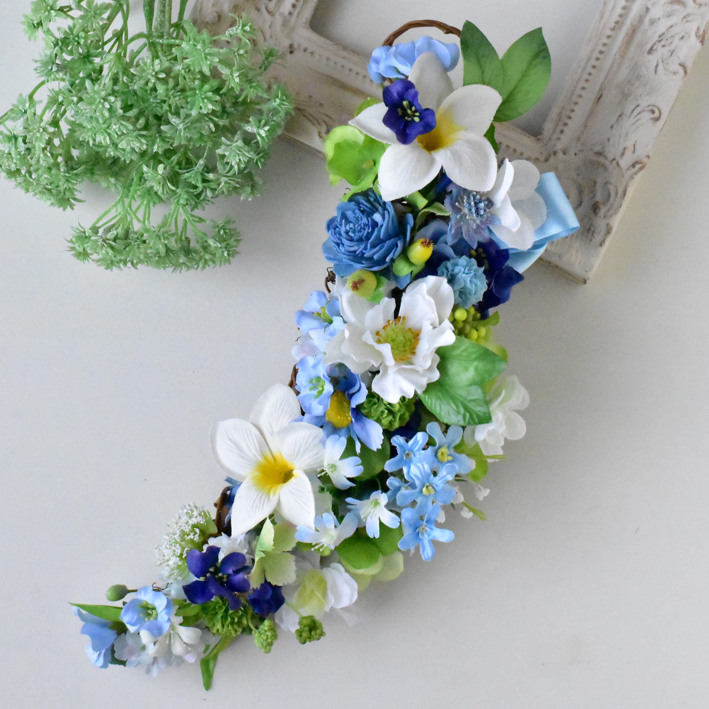 清らかな水が流れるような清々しさと小花のあしらいに優しい風を感じられる爽やかな月型のリースです。