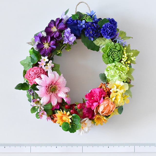 虹色の華やかなリース。 少し大きめで、その色合いからも存在感があります。 アーティフィシャルフラワーリース。直径 約20cm。 ※背景の小物は商品に含まれません。 ※モニターによって実際の作品の色味と異なって見える場合がございます。